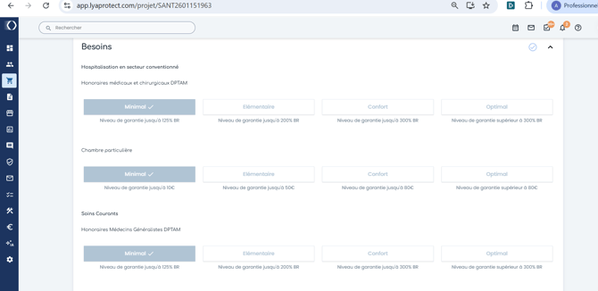 Descendez jusqu'à la section Besoins : sélectionnez le niveau de garantie souhaité pour chaque poste (Hospitalisation, Dentaire, Optique, etc.) en choisissant entre Minimal, Élémentaire, Confort ou Optimal.
