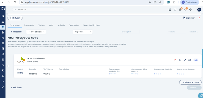 Renseignez l'assureur, le nom du produit, la formule et le montant de la prime. Cliquez sur Ajouter le devis.