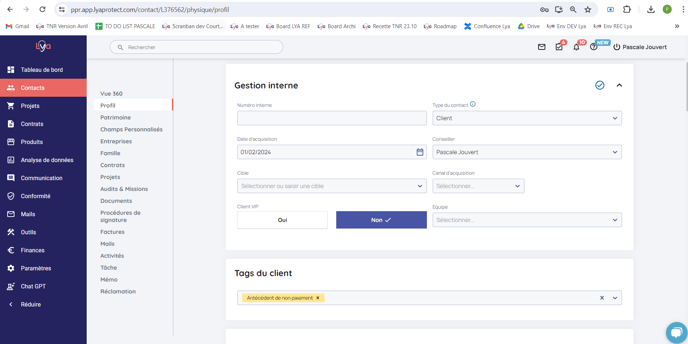 Pour modifier les tags d'un contact, il suffit de se rendre dans sa rubrique "Profil" > "Tags du client". Il est possible ici d'ajouter ou de supprimer un tag au contact (sauf si c'est un tag réservé au profil administrateur).