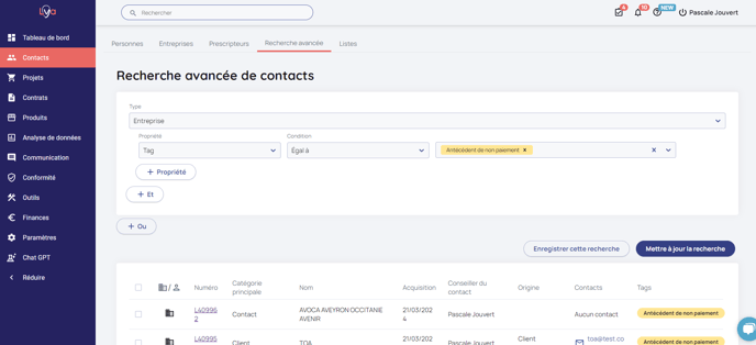 Il est également possible de filtrer sur les tags dans la recherche avancée de contact. Pour cela, après avoir sélectionné un type "personne" ou "entreprise", ajoutez une propriété "tag" et une condition associée puis cliquer sur "Mettre à jour la recherche".
