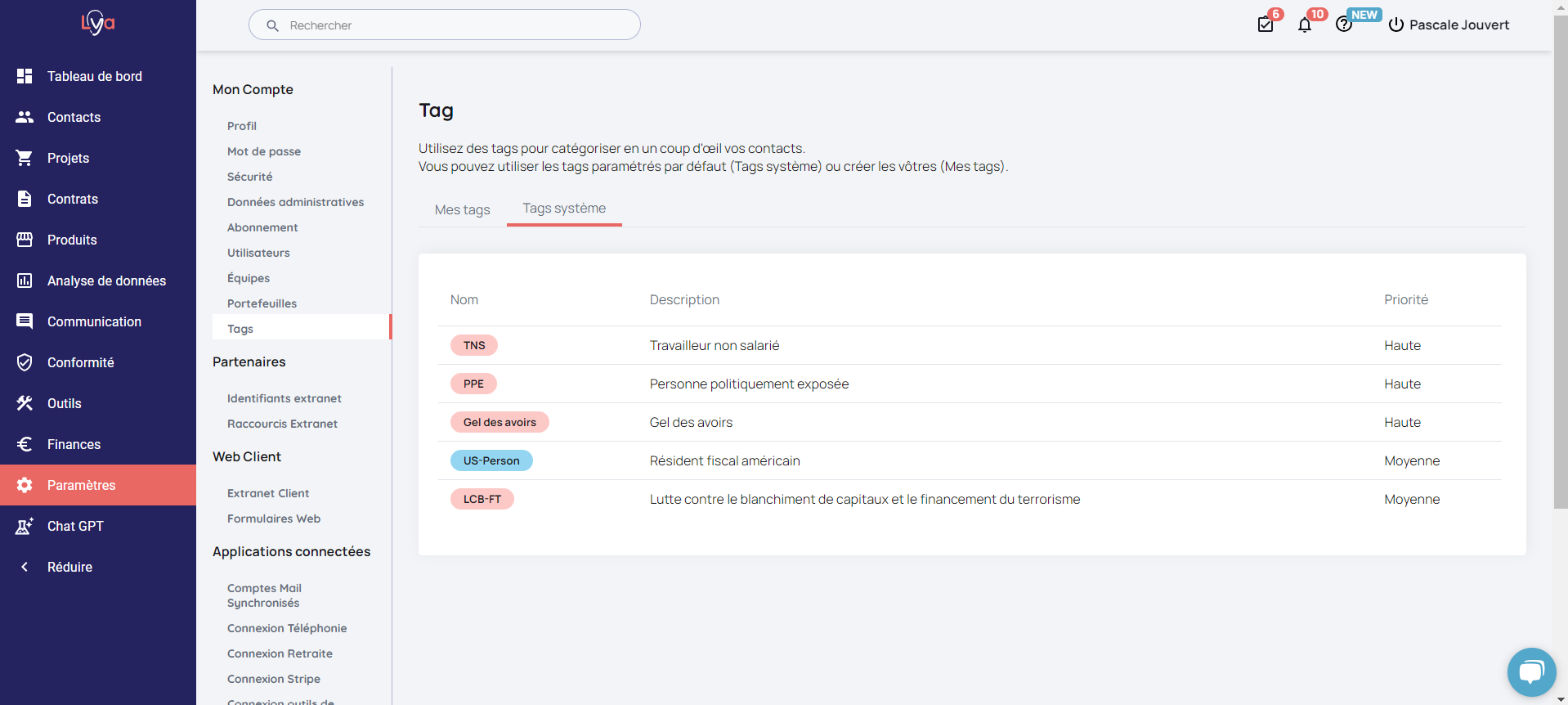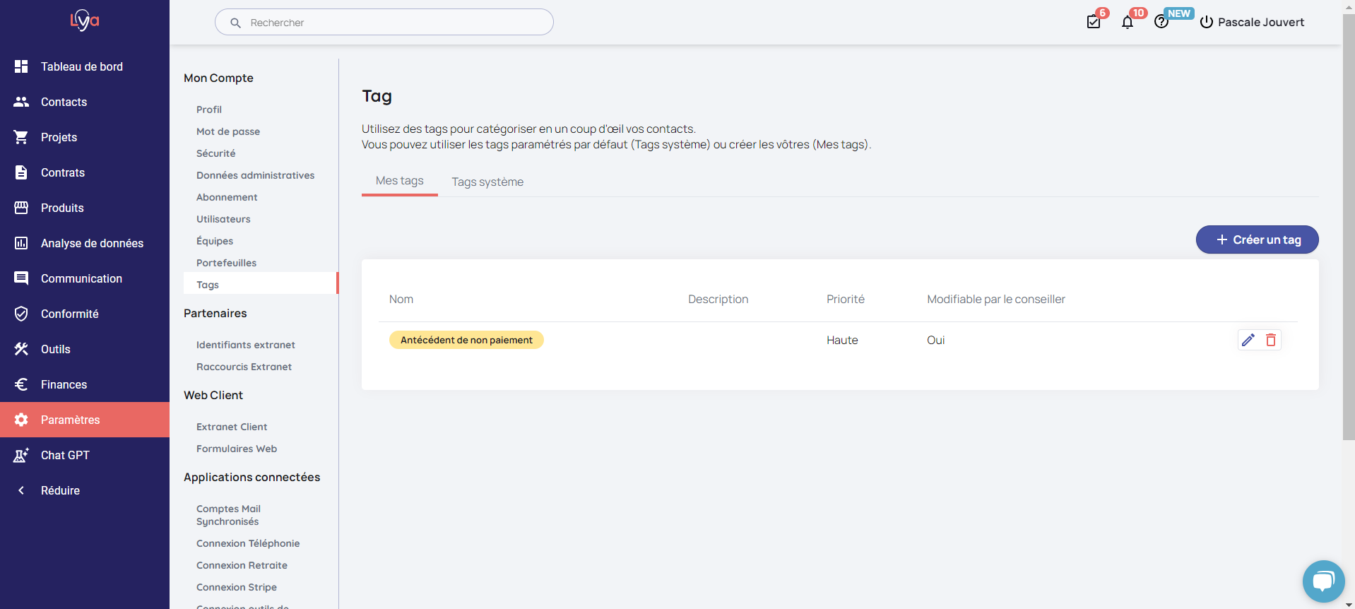 La liste des tags du cabinet est accessible dans la rubrique "Paramètres" > "Tags".