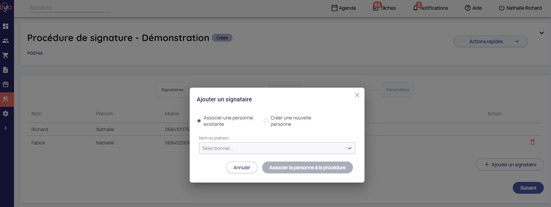 Préalable : Une procédure de signature électronique doit avoir au moins 1 signataire et au maximum 3 signataires.