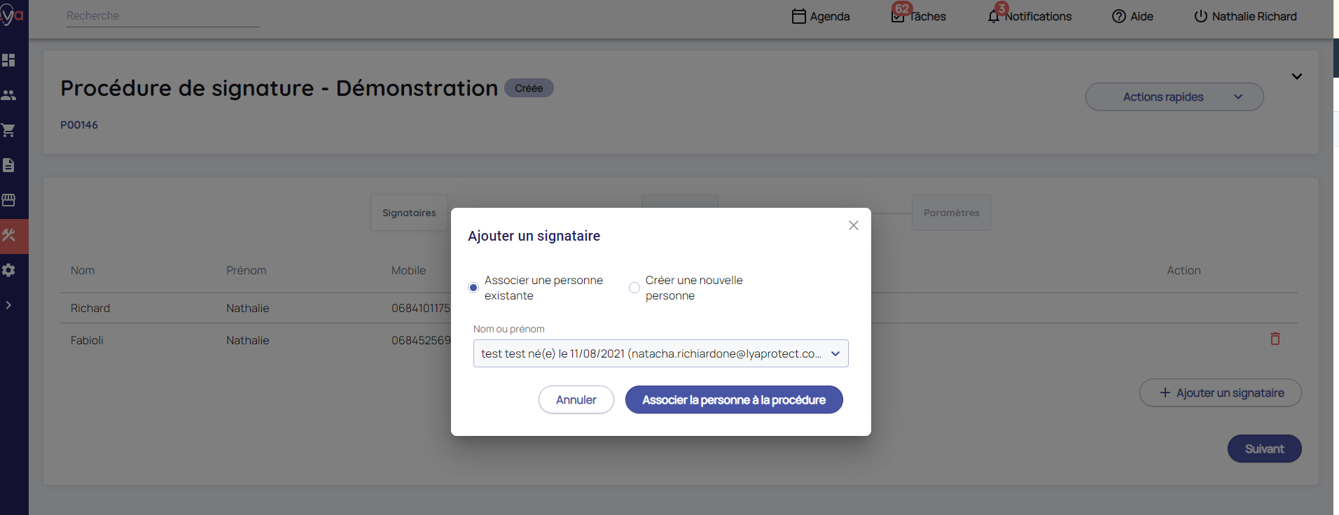 Pour associer une personne existante, cliquez sur l'onglet "Associer une personne existante" saisissez son nom ou prénom dans le champ de recherche, sélectionnez la personne souhaitée et cliquez sur Associer la personne à la procédure.