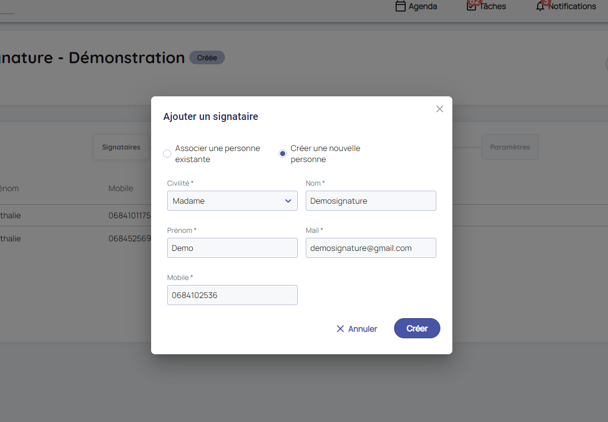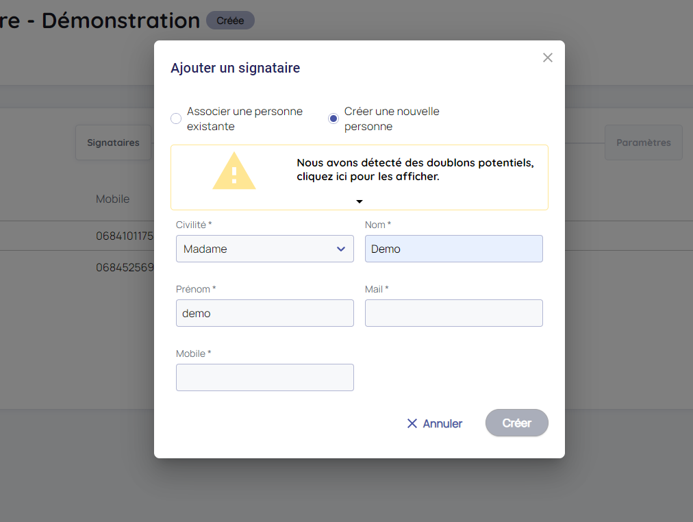 Si la personne que vous souhaitez créer est déjà existante parmi vos contacts, Lya vous en informe, et vous pouvez alors directement la sélectionner et l'ajouter au signataire.