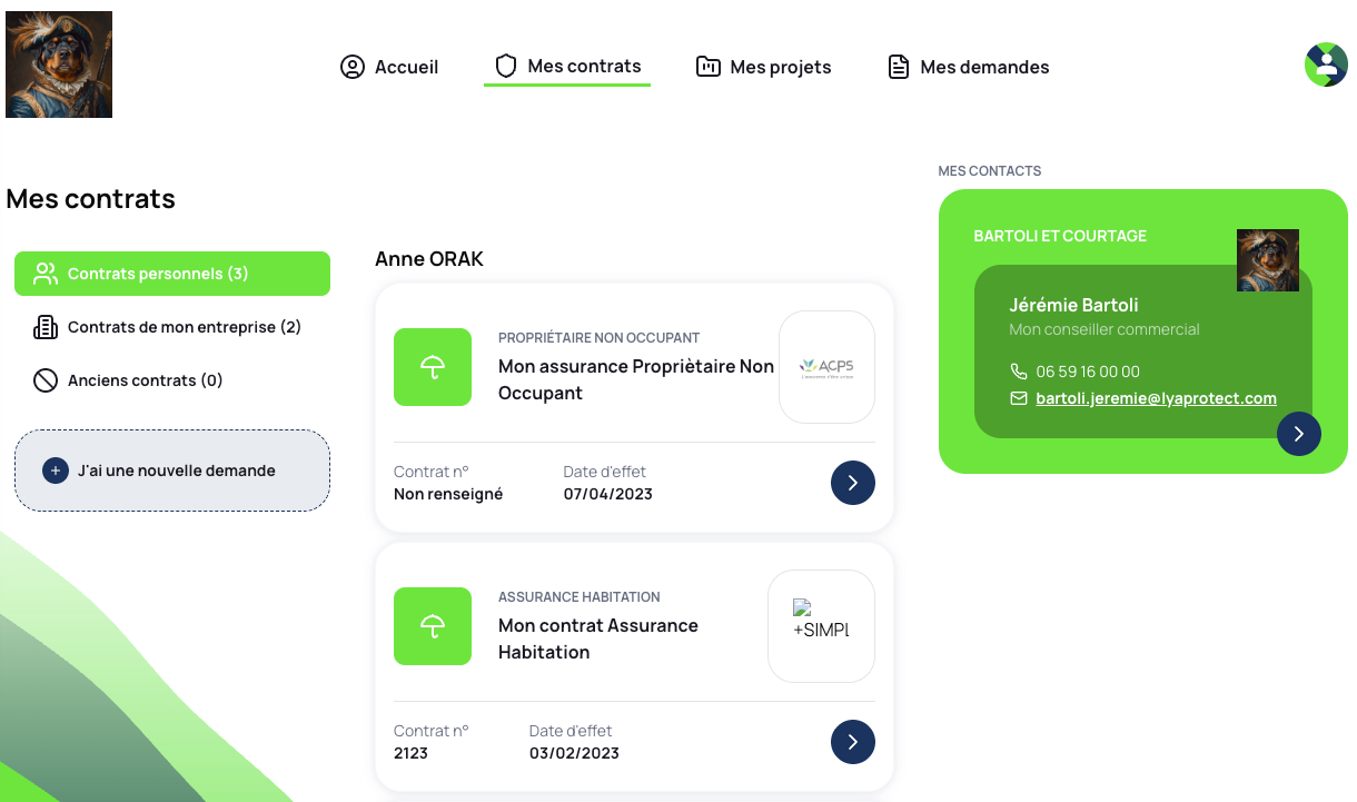 Naviguer via des onglets entre ses Contrats personnels (Habitation, Auto, Santé...) et les Contrats de son entreprise (RC Pro, Décennale...) s'il est dirigeant rattaché.