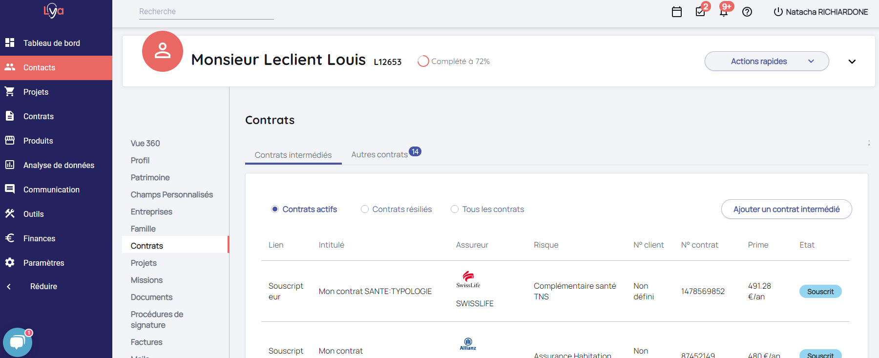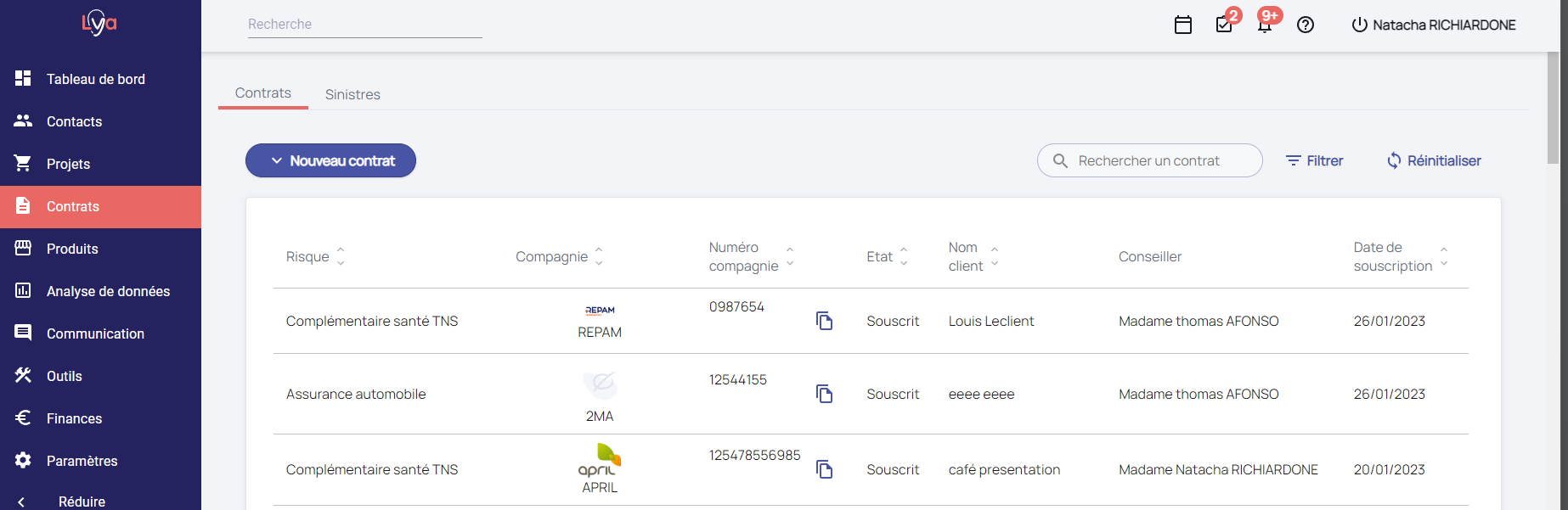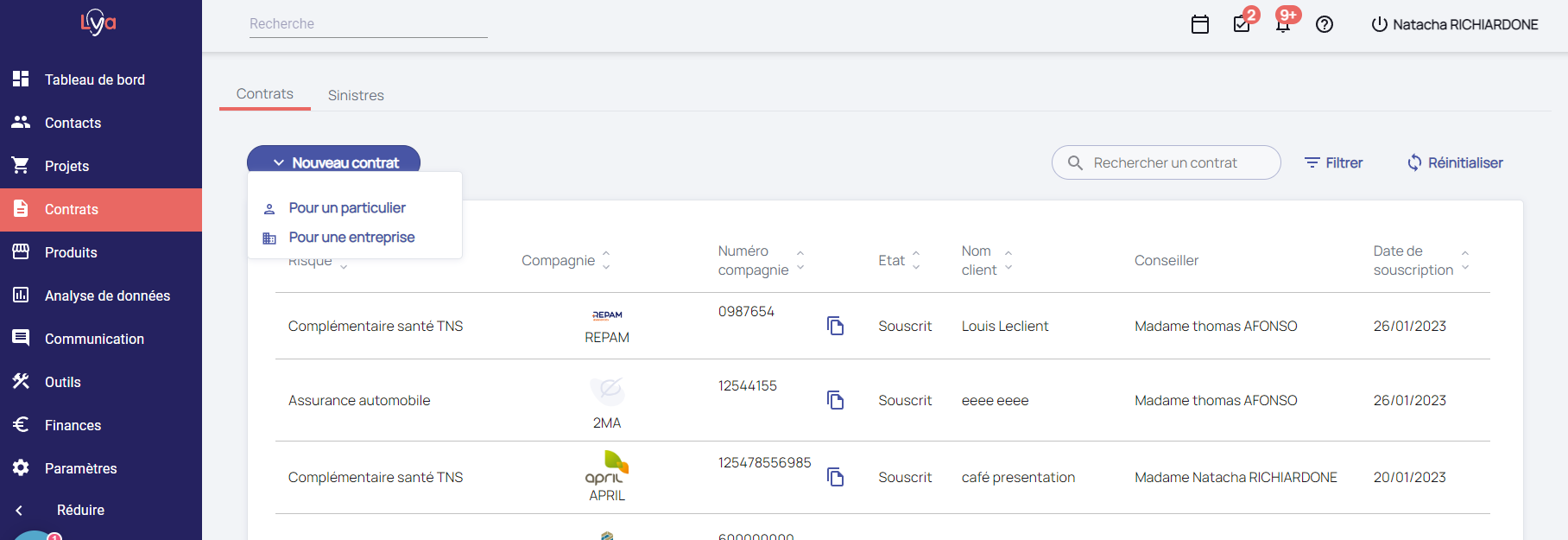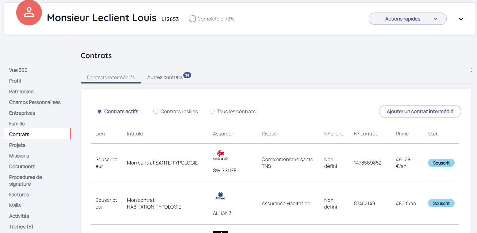 Le contrat saisi apparaît maintenant dans la liste des contrats de cette fiche client.