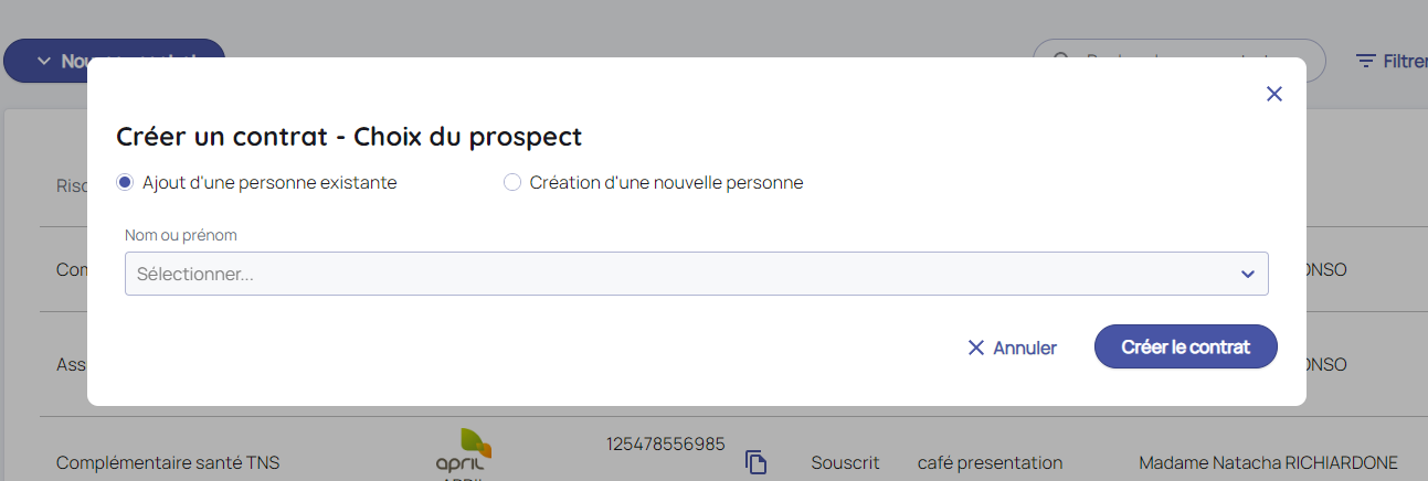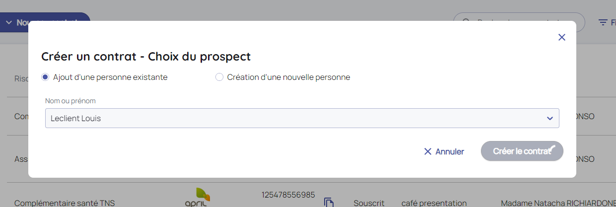 Sélectionner la personne ou créer la personne sur laquelle vous souhaitez créer le contrat puis cliquer sur Créer le contrat :