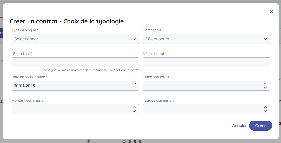 Données du contrat :- Type de souscription (intermédié ou non intermédié)