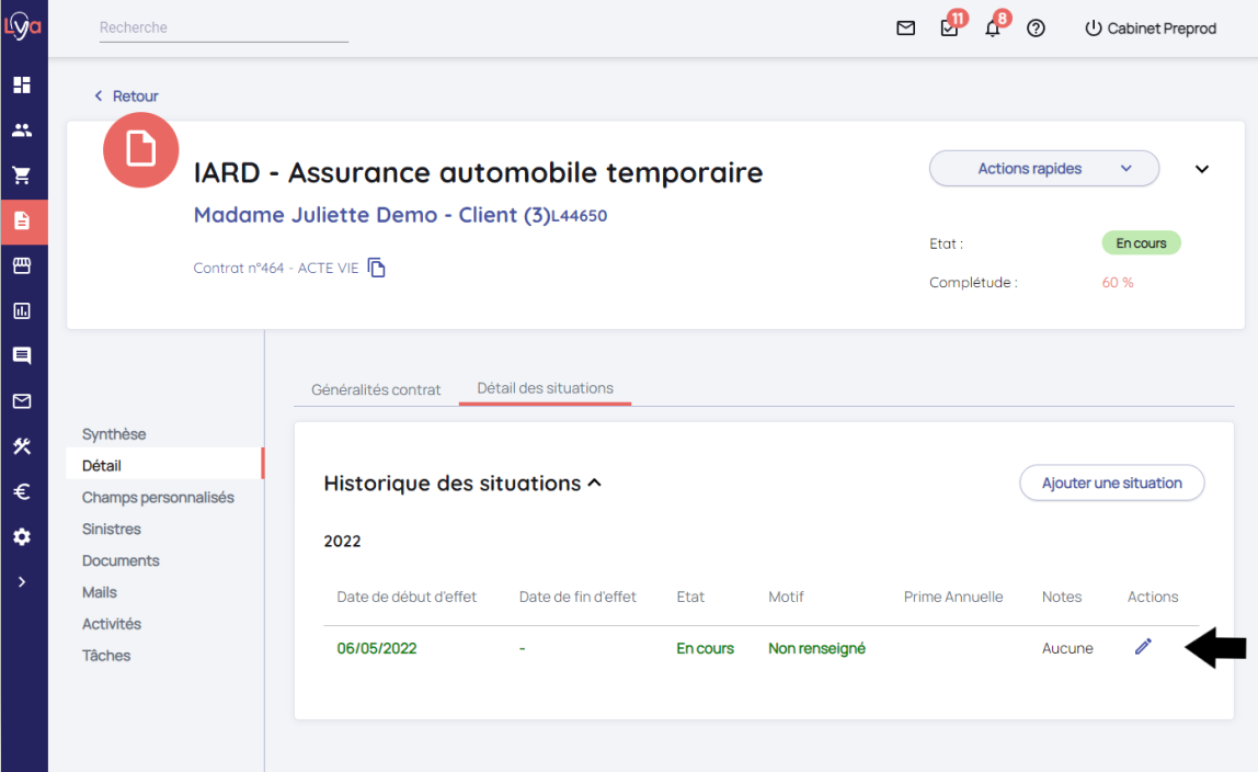 Ensuite, pour renseigner de manière plus précise les informations de la situation, il faut ouvrir l'onglet "Détail des situations" puis cliquez sur la situation à modifier.