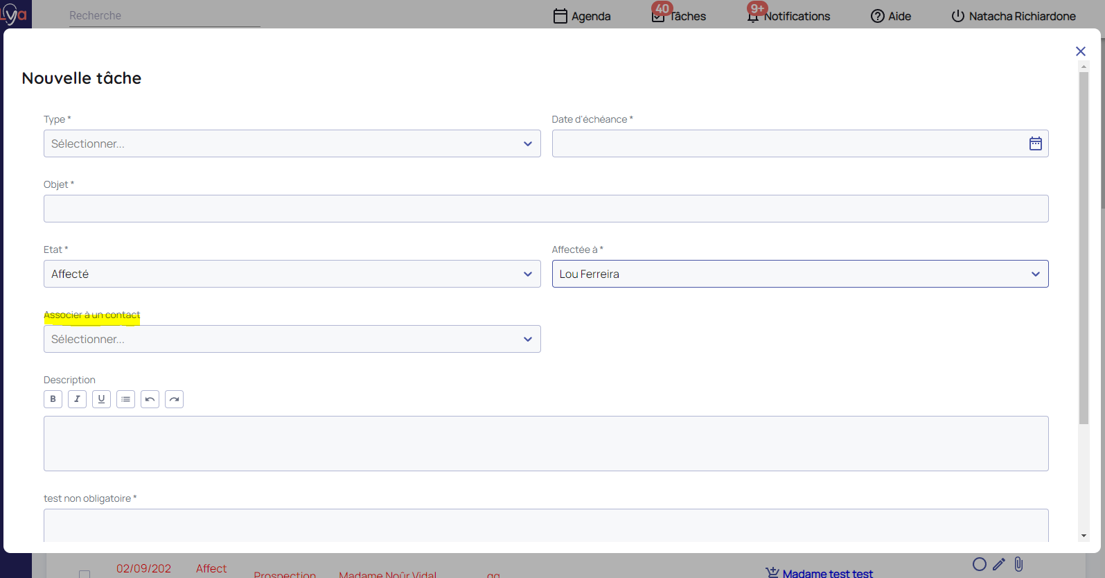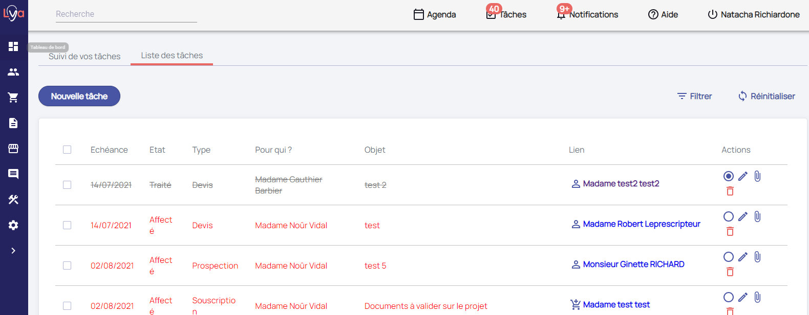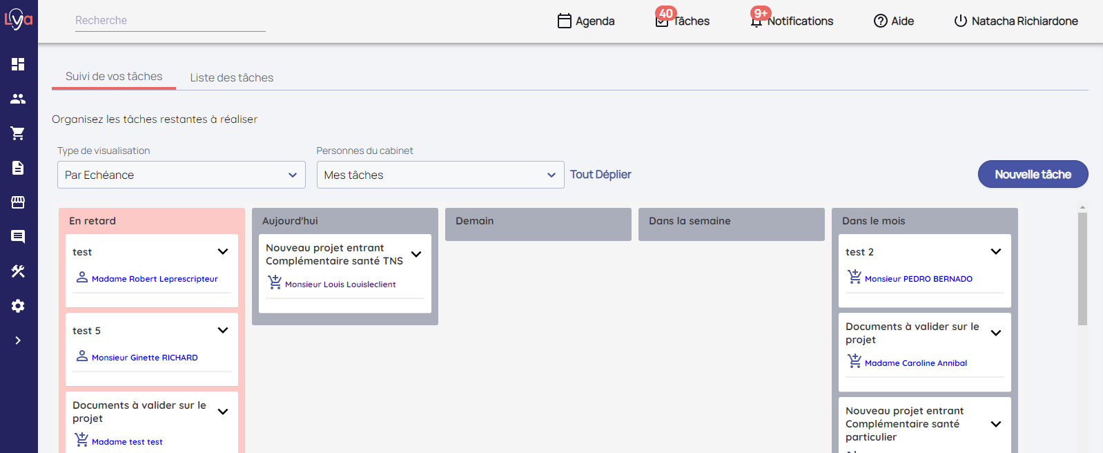 Pour suivre votre relation client, Lya Courtage vous permet de créer des tâches depuis depuis l'écran de suivi des tâches ou depuis une fiche client, projet, contrat, sinistre.