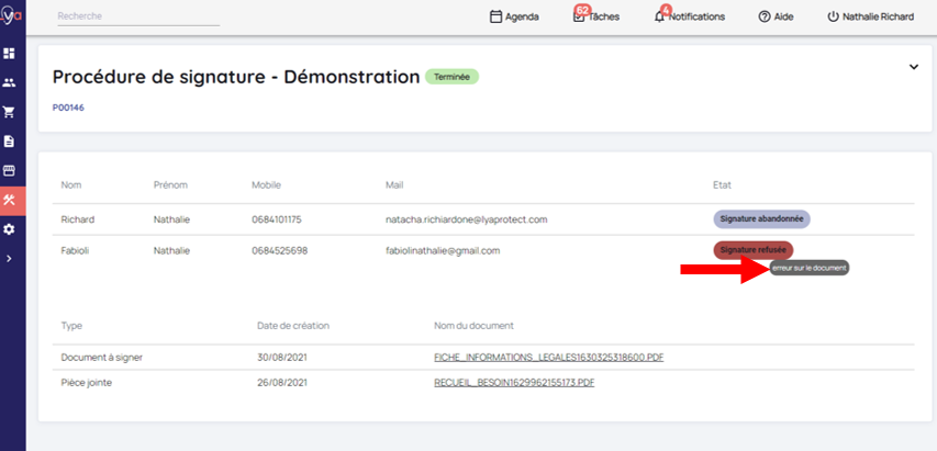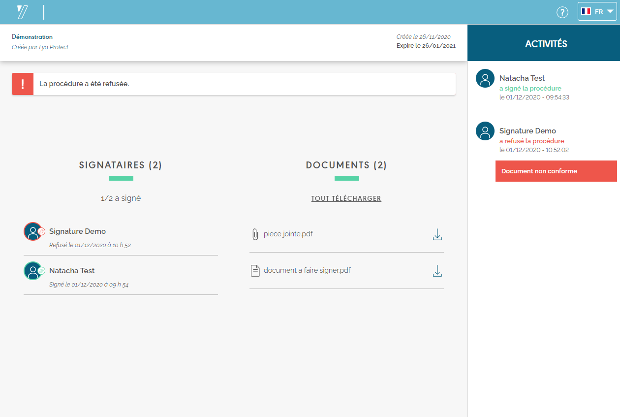 A savoir : Lorsqu'une procédure de signature est refusée, elle ne peut pas être relancée. Il convient de créer une nouvelle procédure si vous souhaitez faire signer de nouveau le document.
