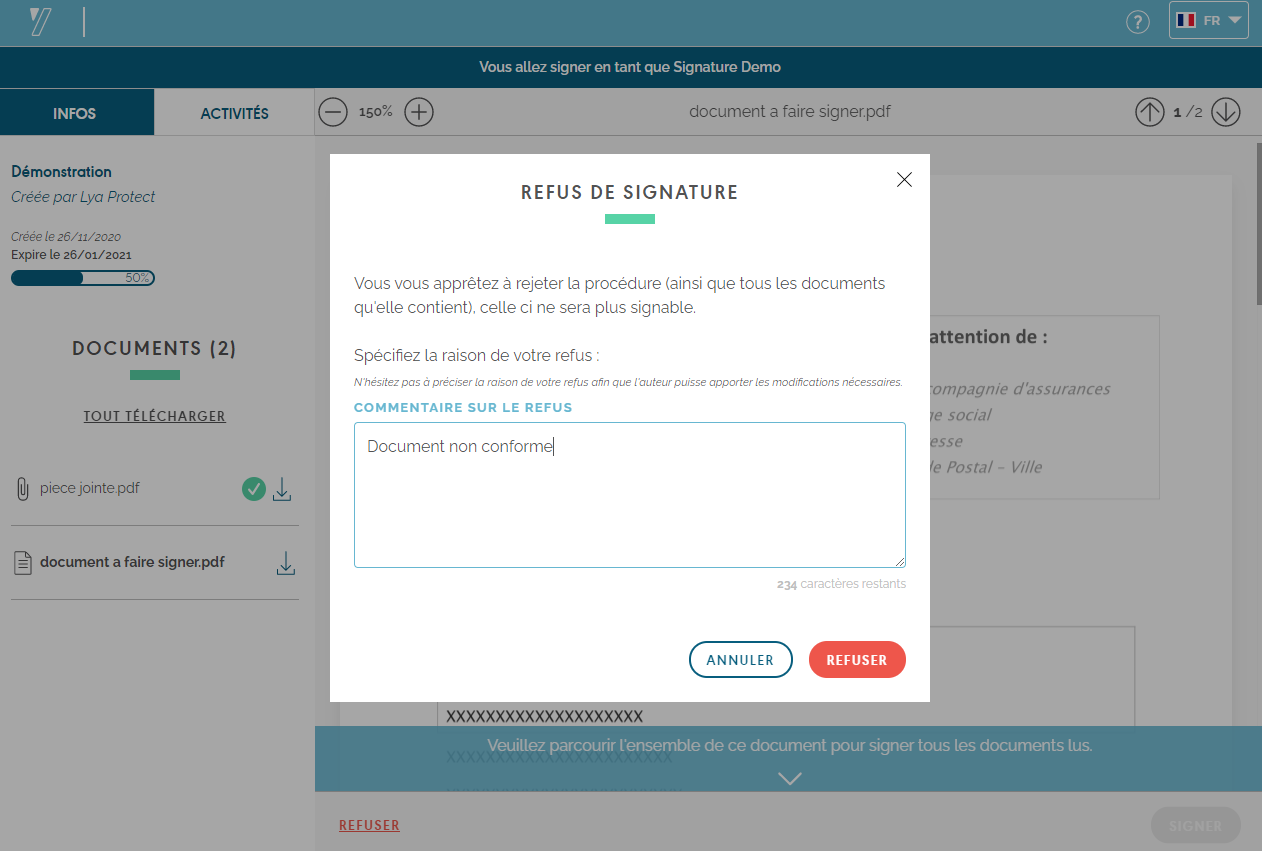 Une fenêtre s'ouvre lui permettant de confirmer son refus de signer et d'y adjoindre éventuellement un commentaire. Il convient de cliquer sur Refuser pour valider le refus.