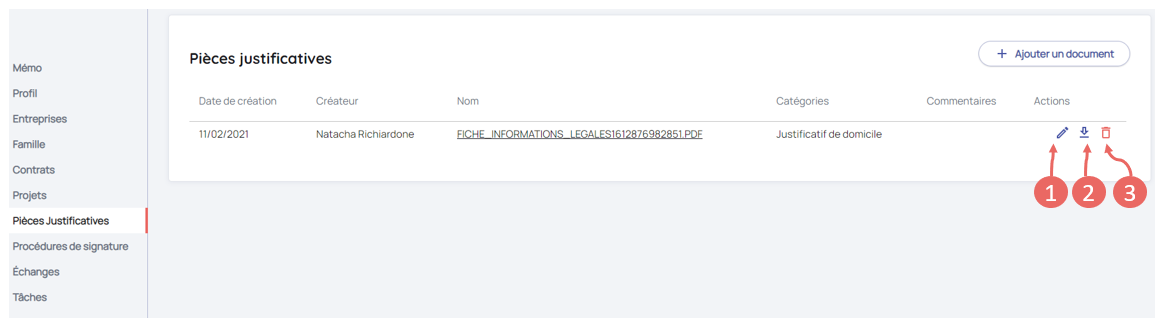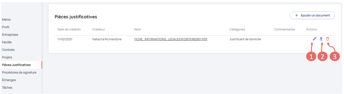 Pour supprimer un document, il suffit de cliquer sur l'icône 3