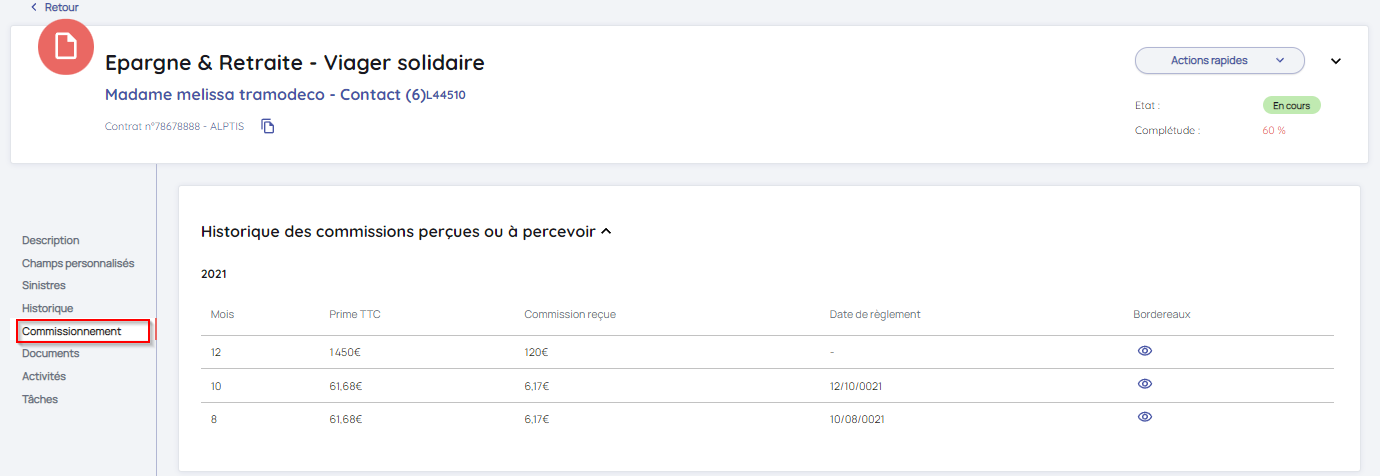 Depuis les fiches contrats, le menu "commissionnement" permet de visualiser les commissions reçues pour le contrat dans un bordereau.