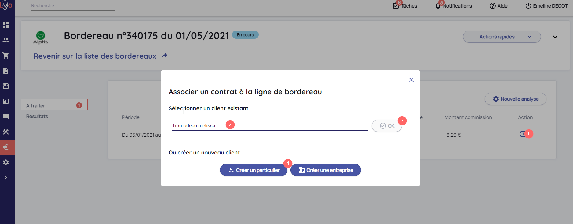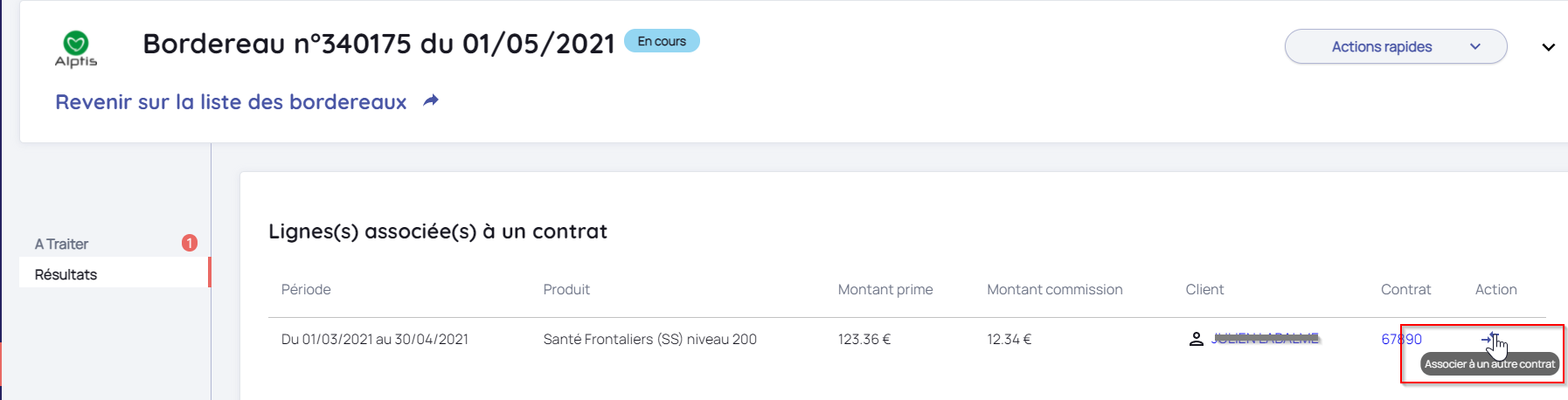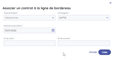 Si le contrôle ne parvient pas par lui même à associer une ligne d'un bordereau à un contrat en portefeuille (parce que le client et/ou le contrat n'ont pas été saisi dans le CRM ou que les informations entre le bordereau et le CRM divergent), l'utilisateur à la possibilité d'associer manuellement la ligne.
