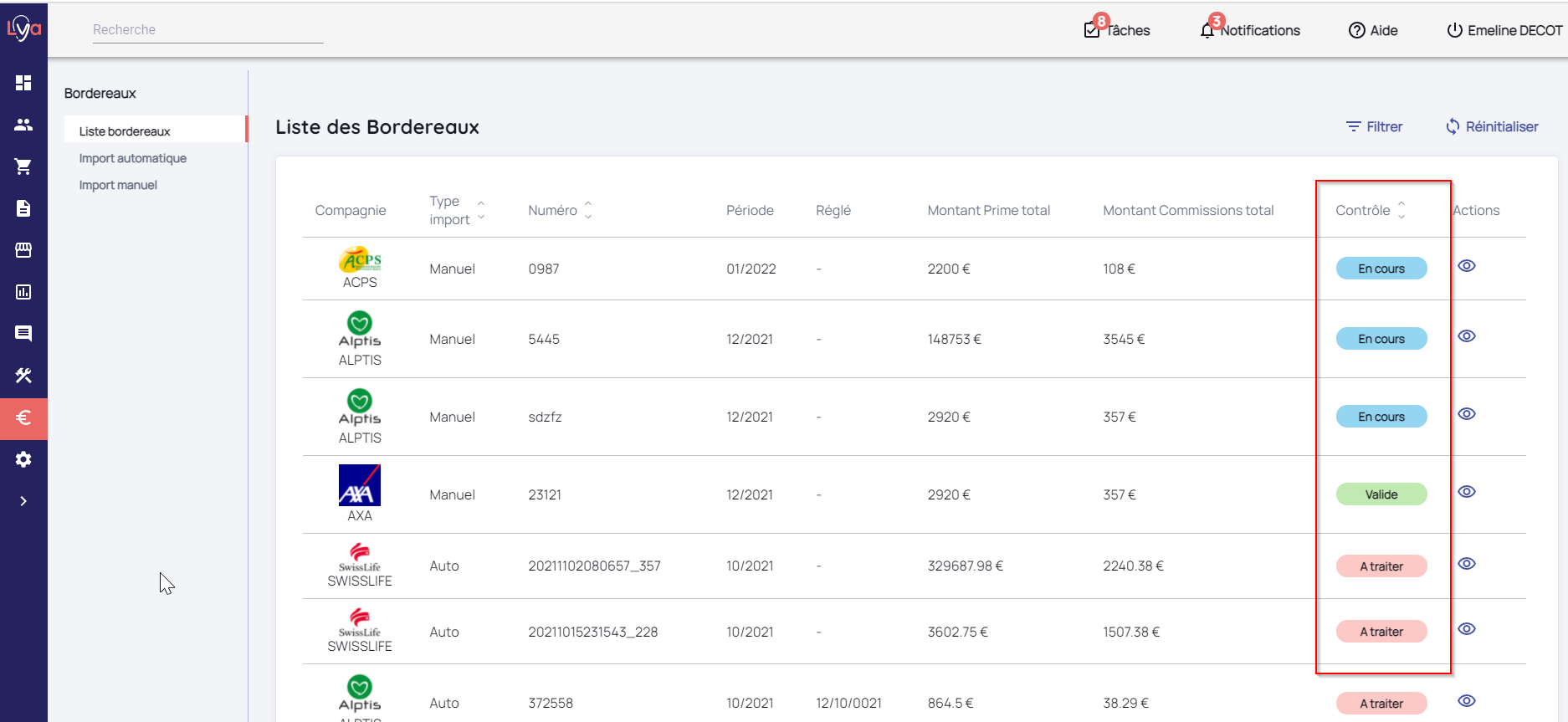 - En cours : le contrôle a été fait au moins une première fois, toutefois, toutes les lignes du bordereau n'ont pas pas pu être associées à un contrat. De ce fait, le contrôle est "en cours".