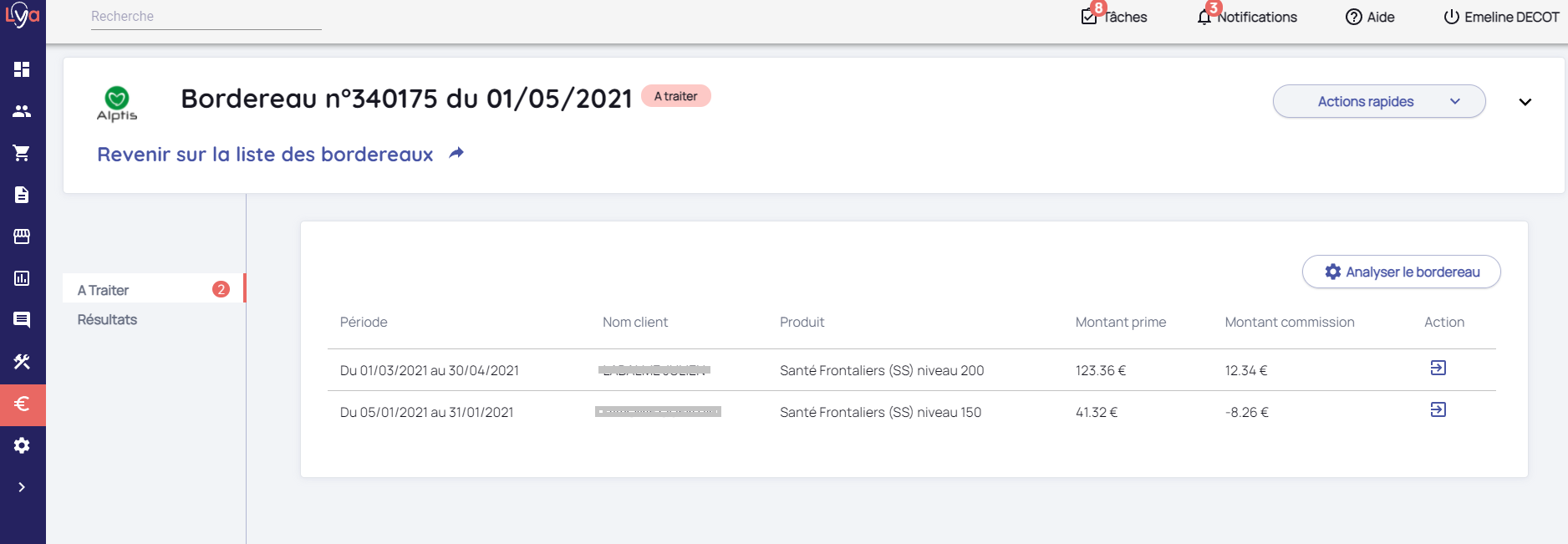 Le traitement de l'analyse et de contrôle permet de rechercher dans les contrats en portefeuille lesquels correspondent aux lignes présentes dans le bordereaux.