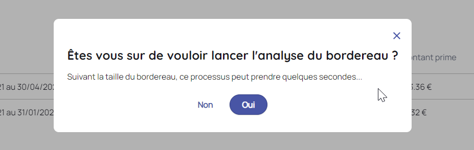Au clic sur le bouton "Analyser le bordereau", une demande de confirmation permet à l'utilisateur de valider ou non le contrôle et lui indique que cette opération peut prendre quelques secondes si le bordereau contient beaucoup de lignes: