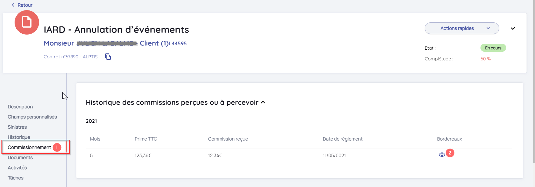 Une fois une ligne de bordereau associée à un contrat, cette dernière est affichée et présente dans la fiche du contrat dans le menu Commissionnement (1) (affiché si et seulement si il y a au moins une ligne de bordereau rattaché à ce contrat) :