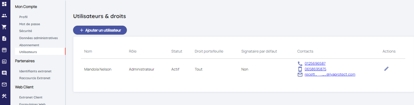 L'écran des utilisateurs liste l'ensemble des utilisateurs de Lya Courtage.
