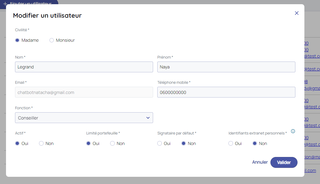 Le formulaire est identique à celui de création d'un utilisateur. L'ensemble des champs est modifiable sauf le mail qui permet d'identifier la personne.