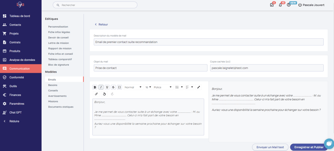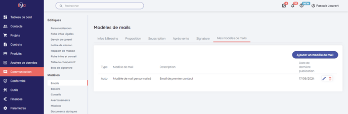 Pour paramétrer vos modèles de mails, allez dans la rubrique “Communication” > “Modèle” > "Email" > "Mes modèles de mails".