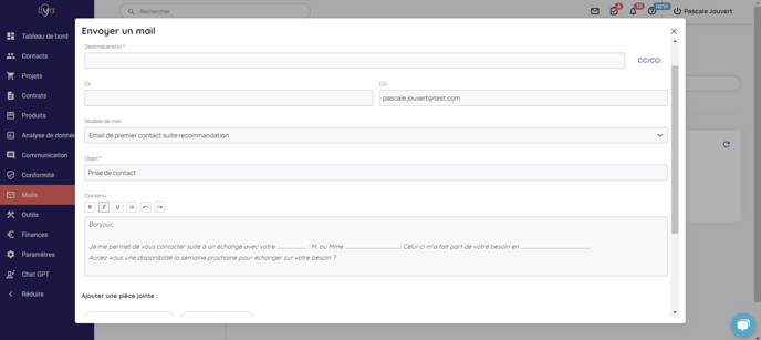 La sélection d'un modèle renseigne automatiquement l'objet, le contenu du mail ainsi que l'email en copie cachée.