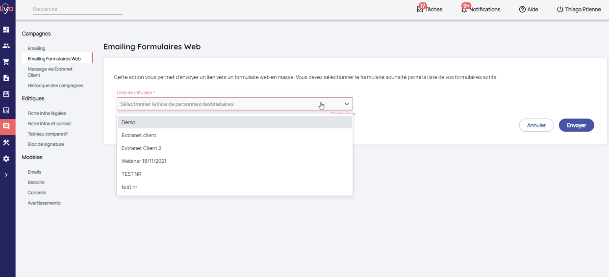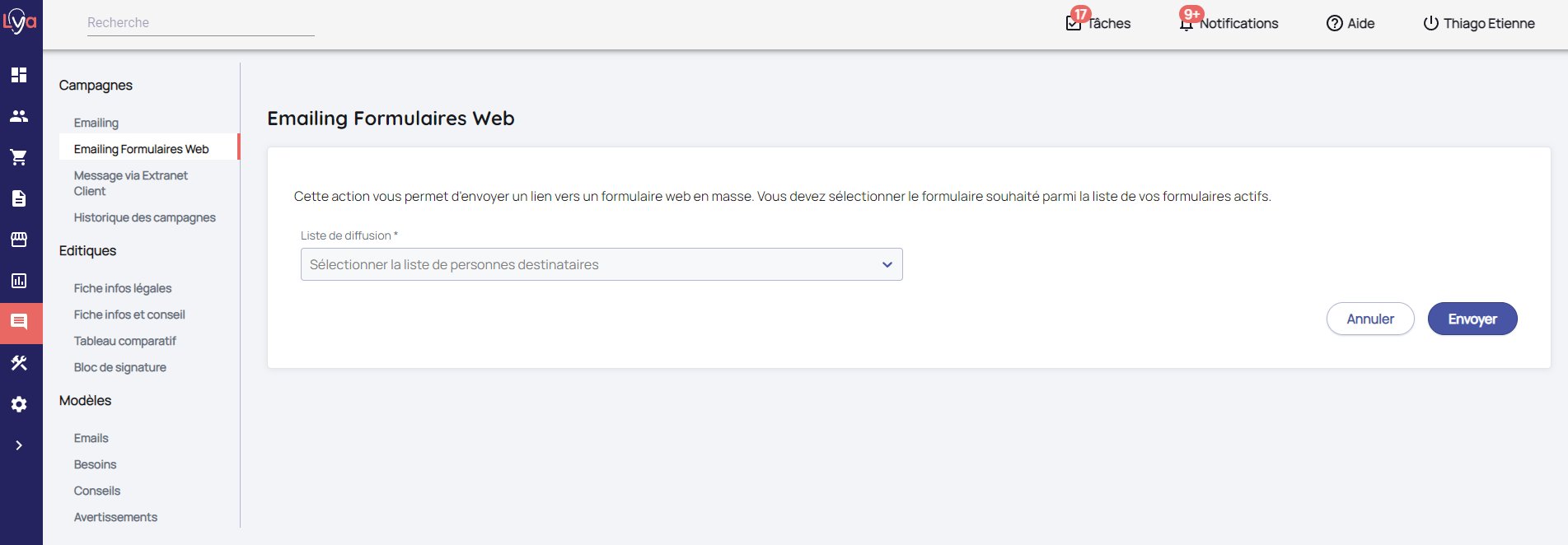 Lya vous permet d'effectuer des communications de masse. Vous pouvez depuis le menu Communication, envoyer des liens vers des formulaires Grand Public à des listes de contacts.
