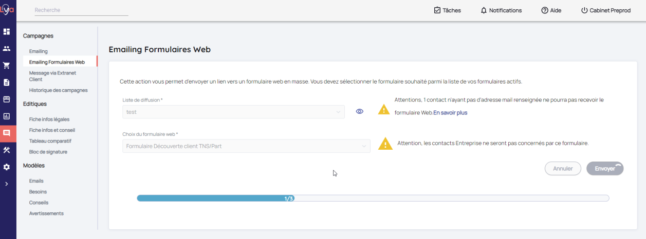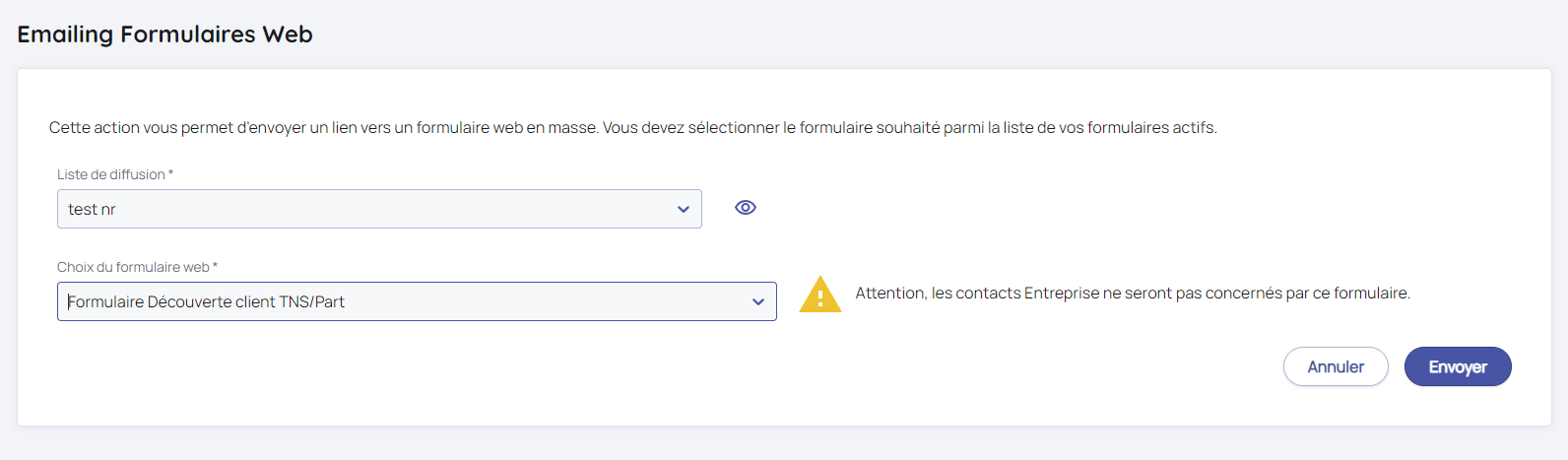 En fonction du formulaire web sélectionné, tous les contacts de la liste peuvent ne pas être concernés. Aussi le système vous informe quels types de contact ne sont pas concernés par l'envoi de ce formulaire web en masse (un formulaire peut concerner uniquement des contacts de type particulier ou uniquement de type entreprise ou les 2).