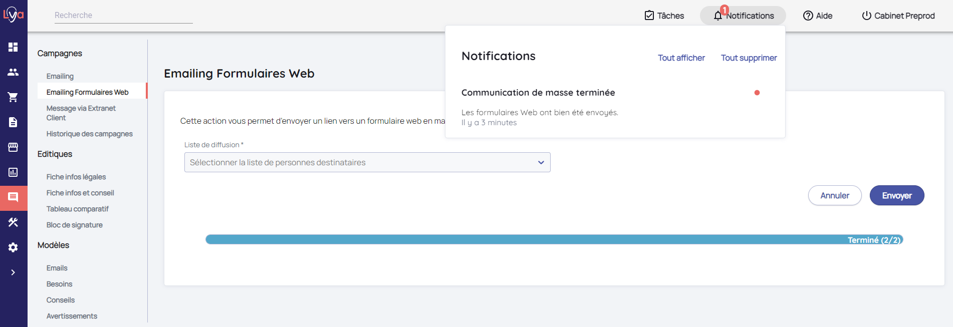 Vous réceptionnerez une notification dès lors que l'envoi de l'emailing formulaire web sera terminé.
