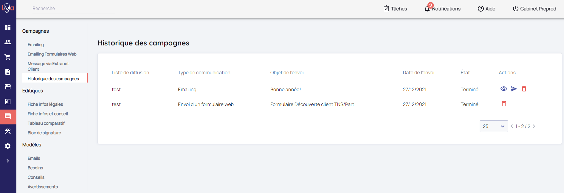 Vous retrouvez toutes les communications de masse effectuées dans l'onglet Historique des campagnes.