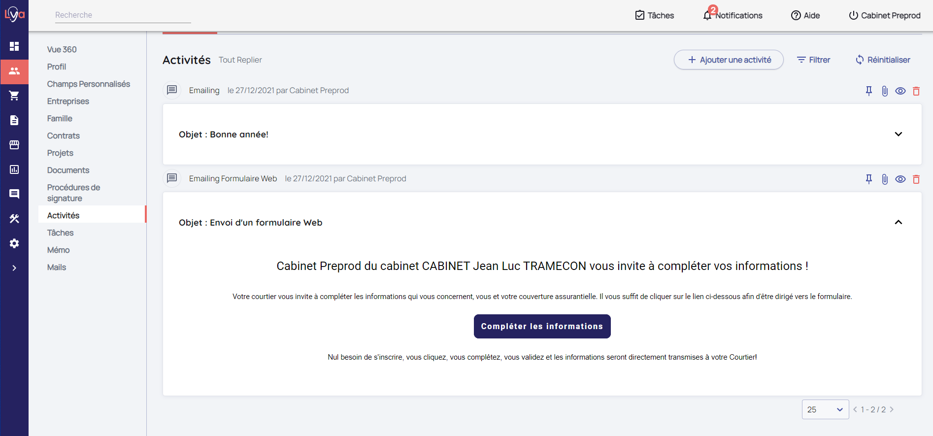 - L'envoi de l'emailing est également tracé dans l'onglet Activités de la fiche du contact concernée. L'envoi d'une communication de masse sera automatiquement sauvegardé dans les activités du contact.