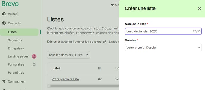 Pour cela, il faut se rendre dans Contacts > Listes, puis créer une nouvelle liste.