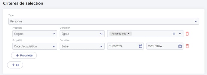 Pour notre exemple, je choisi de cibler tous les clients ayant l'origine "Achat de lead", et ayant été importé sur mon CRM Lya entre le 1er Janvier 2024 et le 15 janvier 2024.