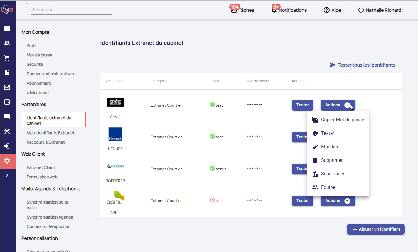Depuis le menu "Paramètres" de l'application LYA COURTAGE, il vous est possible de gérer les accès aux identifiants compagnies.