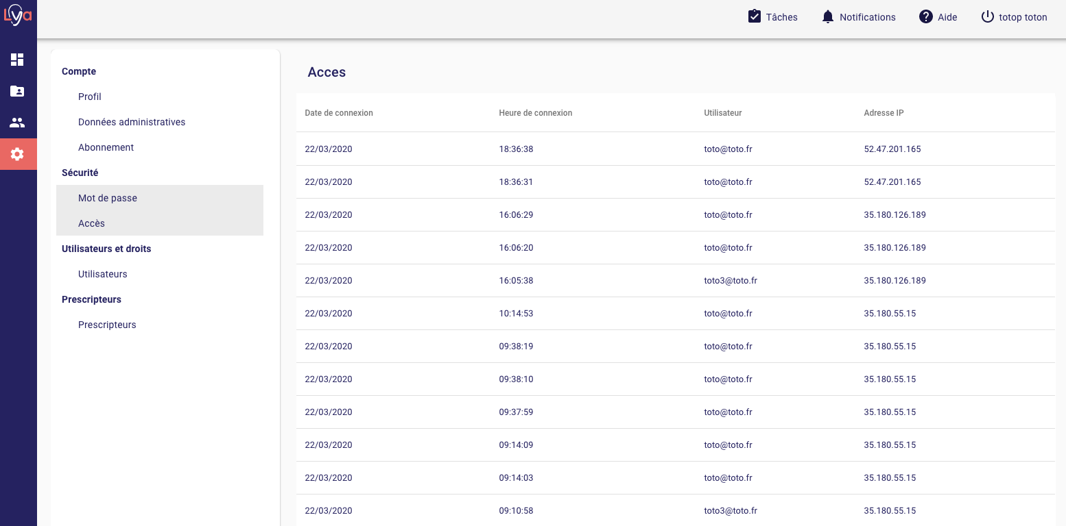 L'écran des accès liste l'ensemble des connexions avec vos identifiants en précisant: