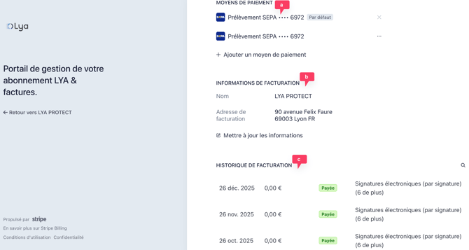 Contexte : Le cabinet Martin a changé de banque principale et doit mettre à jour son mandat SEPA pour éviter une interruption de service Lya Protect.