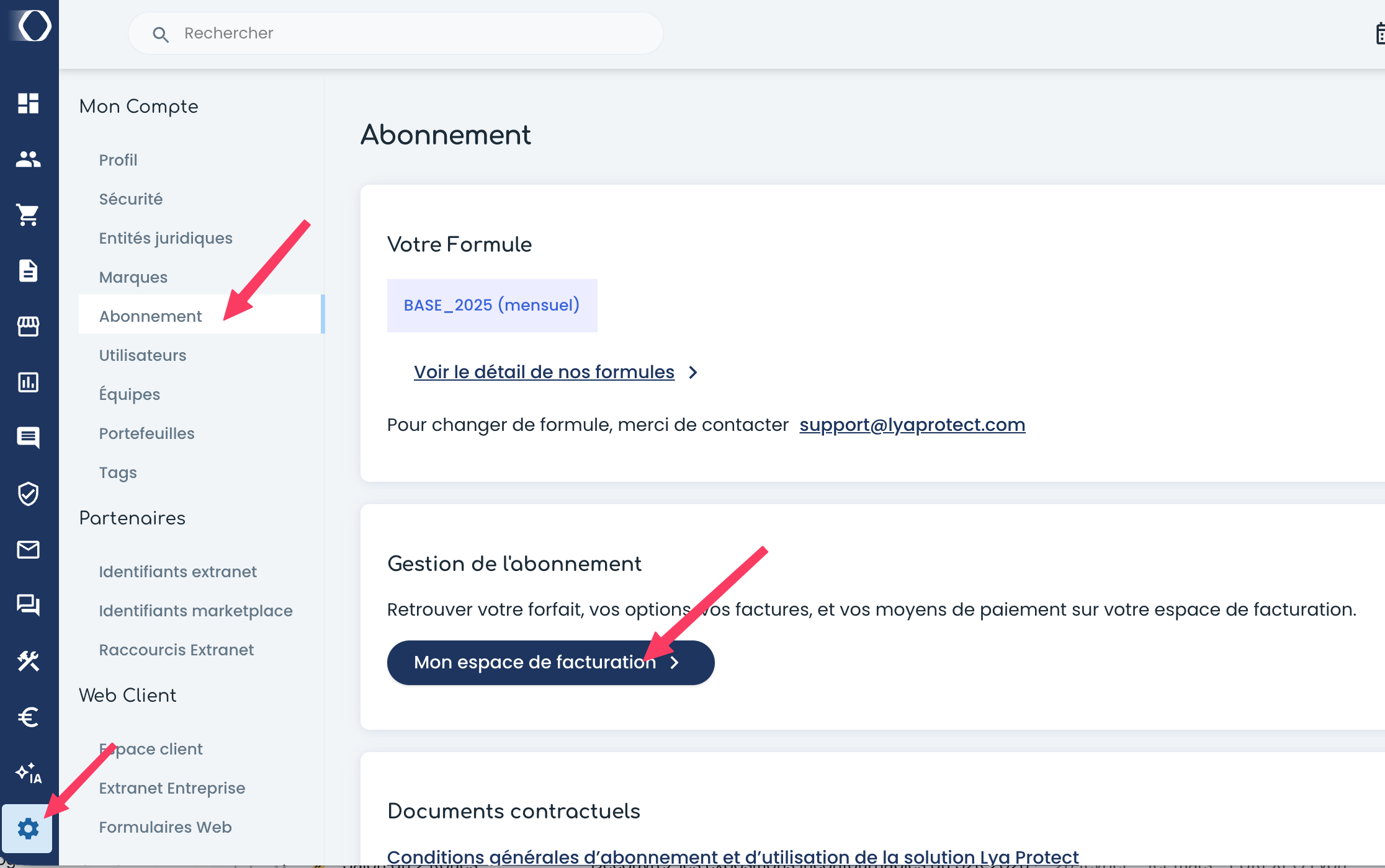 Depuis votre espace, cliquez sur l'icône Paramètres (l'engrenage ⚙️ en bas à gauche), puis sélectionnez le menu Mon Compte > Abonnement.