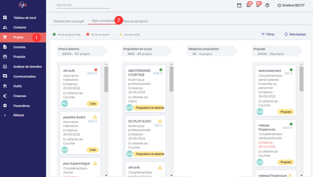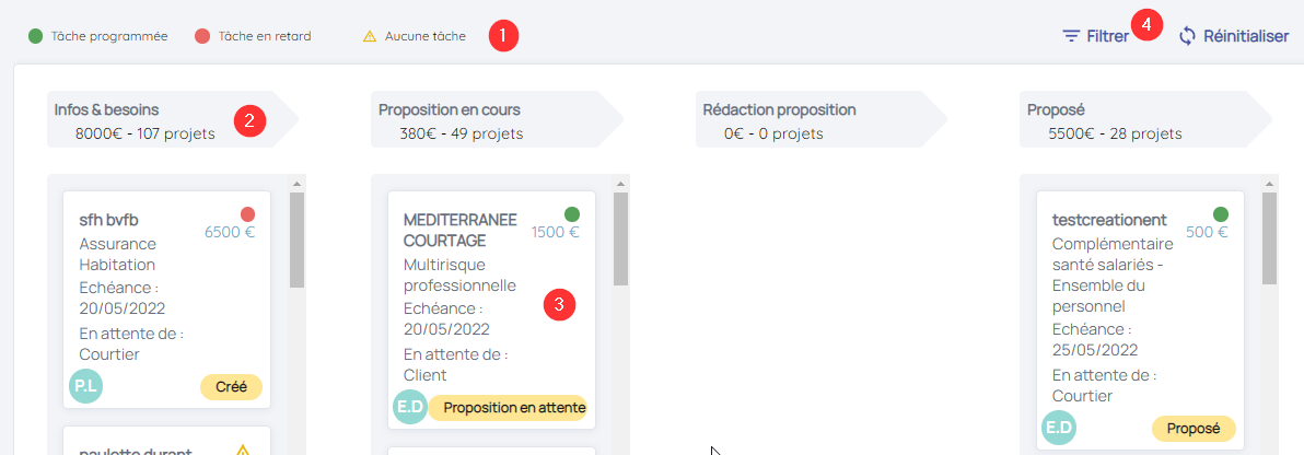- L'état du projet. - Il est possible de filtrer le pipe sur différentes valeurs : Conseiller, état, Typologie, ...