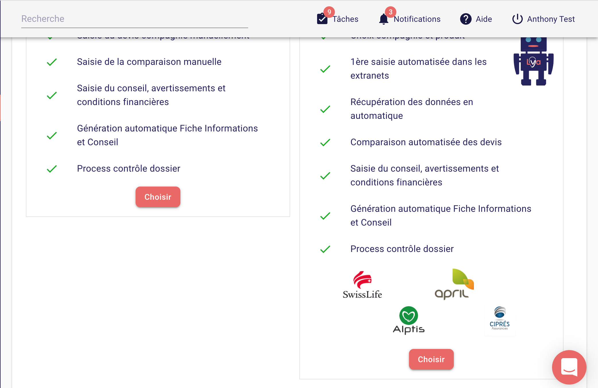 Dans la colonne "Parcours avec robots Lya" en bas vous verrez apparaitre les logos compagnies sur lesquelles les devis pourront être réalisés grâce aux robots Lya.
