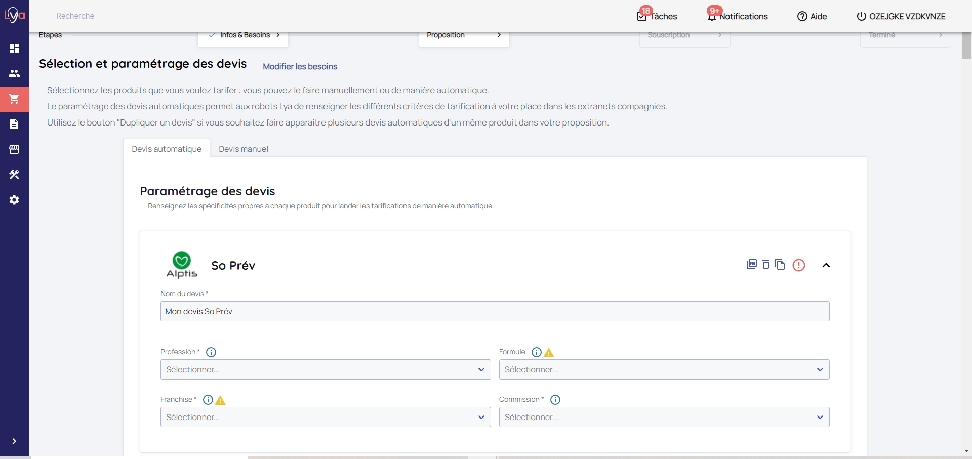 Proposition - Sélection et paramétrage des devis / Devis automatique - Choix produit