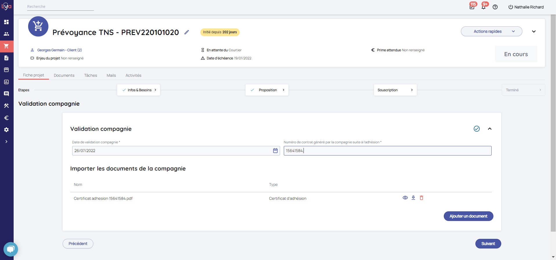 Dernière étape du projet dans laquelle vous enregistrez la date de validation du projet par la compagnie ainsi que le numéro de contrat associé au projet.