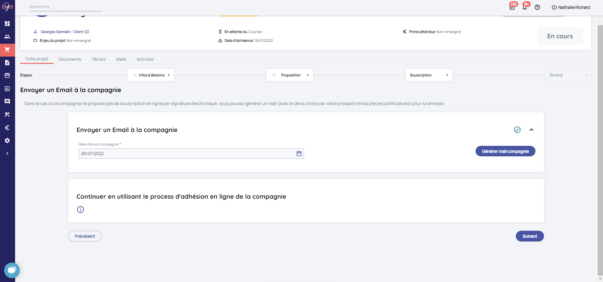 Si vous choisissez de faire votre Devoir de conseil en utilisant les documents compagnie et de ne pas collecter les Pièces Justificatives via Lya, l'écran "Complétude du dossier" ne s'affiche pas et vous allez directement à l'étape "Envoyer Email à la compagnie".