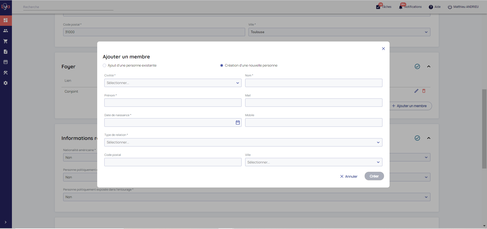 - Renseignez les informations relatives au membre de la famille dans cette Pop up puis validez le :