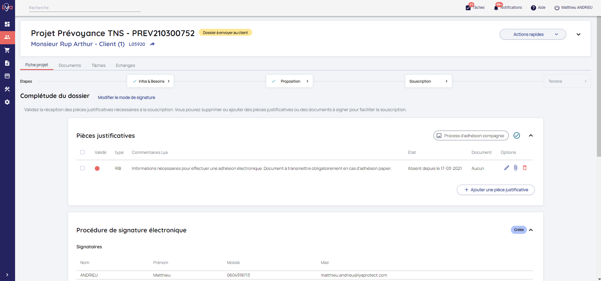 Pour savoir comment signer électroniquement les documents de votre projet, merci de vous reporter à ce FAQ : https://aide.lyaprotect.com/centredaide/comment-faire-signer-%C3%A9lectroniquement-les-documents-au-cours-dun-projet - De collecter ou non les Pièces Justificatives via Lya pour compléter le dossier d'adhésion.