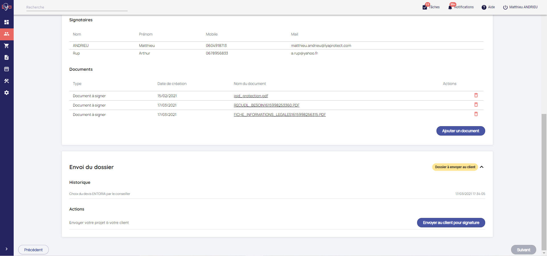 - De faire signer par le client votre Devoir de conseil soit manuellement soit de manière électronique en envoyant les documents souhaités sur l'Extranet client ou par e-mail pour que le prospect les signe électroniquement via notre prestataire Yousign.