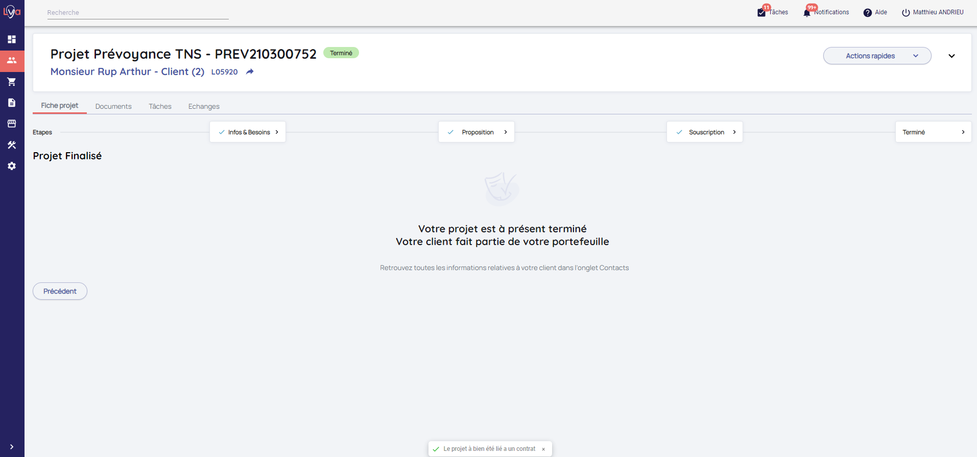 Votre projet est désormais transformé en Contrat disponible dans l'onglet Portefeuille.