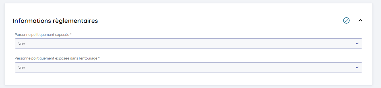 - Les informations réglementaires (Personne politiquement exposée, lutte contre le blanchiment)