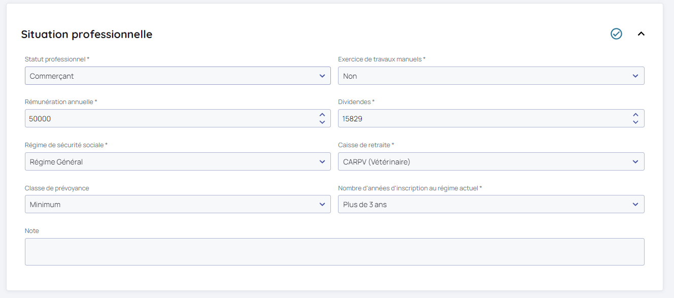 - Un champ Note permettant de mettre des précisions sur la situation professionnelle (son métier exact par exemple)