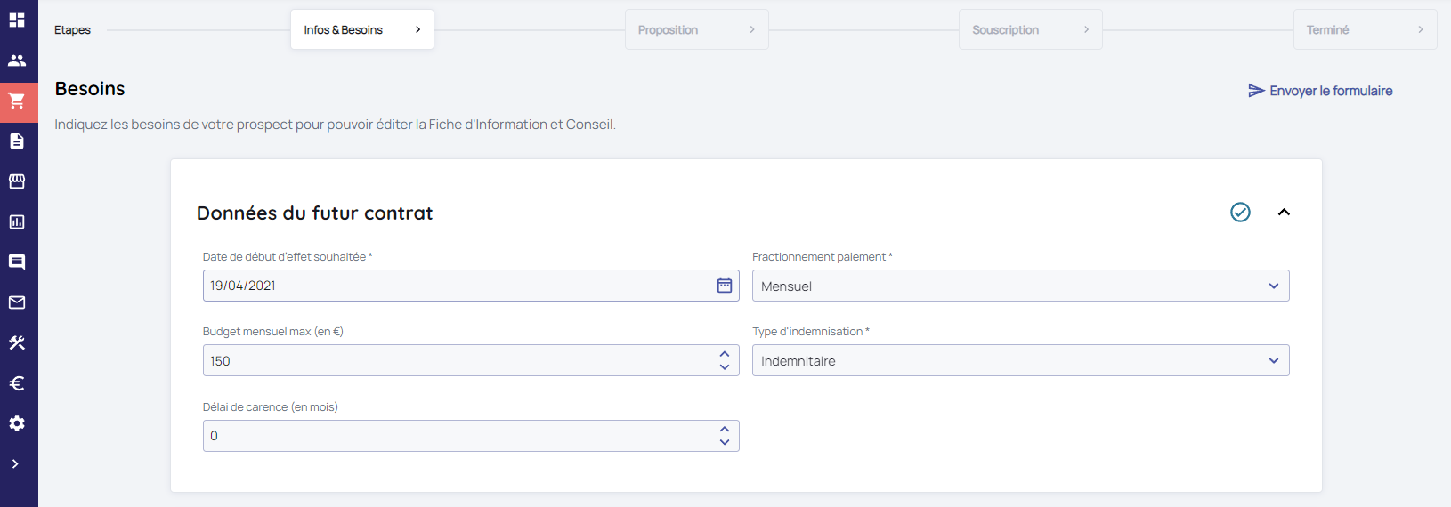 Cette étape permet de saisir les informations sur le contrat actuel. Cela permettra de retrouver ce contrat dans le tableau de comparaison pour mettre en avant auprès du prospect les différences entre son produit actuel et les produits proposés.